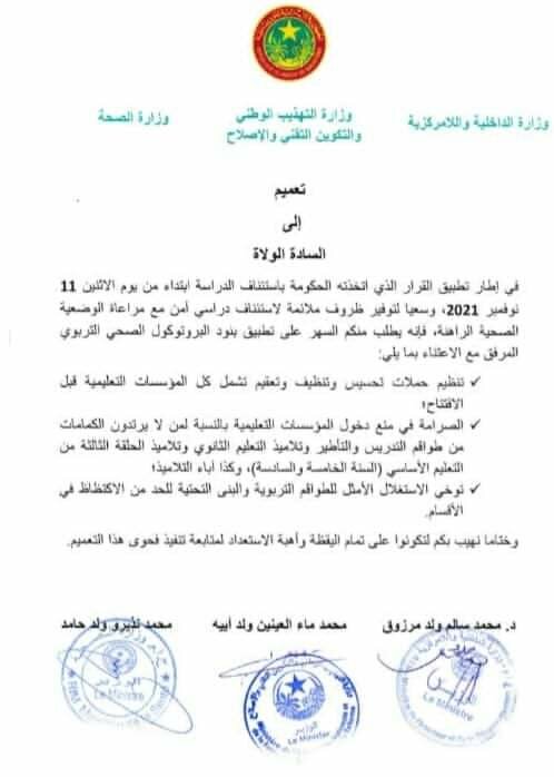 أصدر وزراء الداخلية، والتهذيب الوطني، والصحة تعميما مشتركا يلزم الولاة بالسهر على تطبيق البروتكول الصحي المعتمد للحد من انتشار فيروس كورونا المستجد، مع بداية استئناف الدراسة الاثنين القادم.